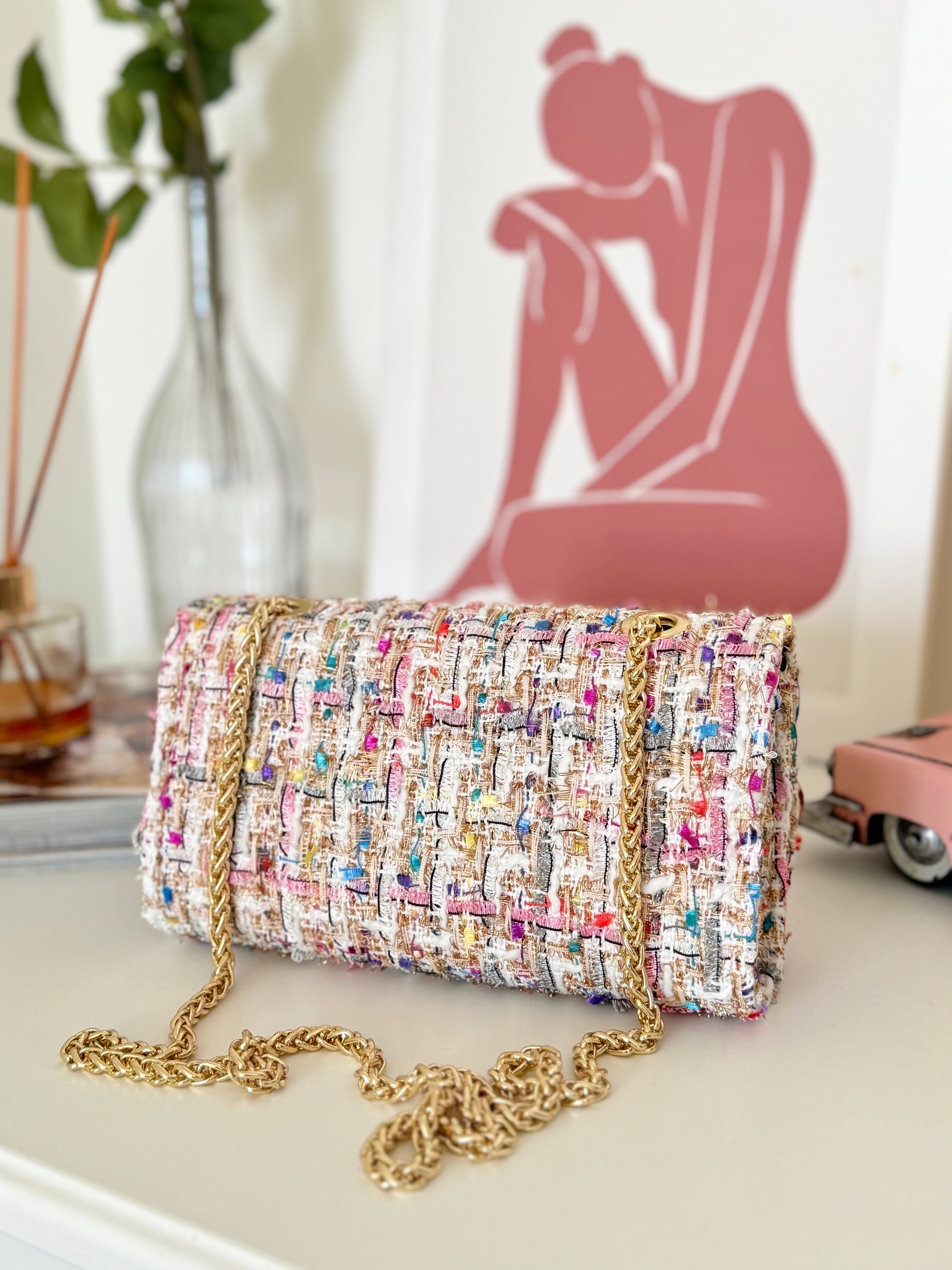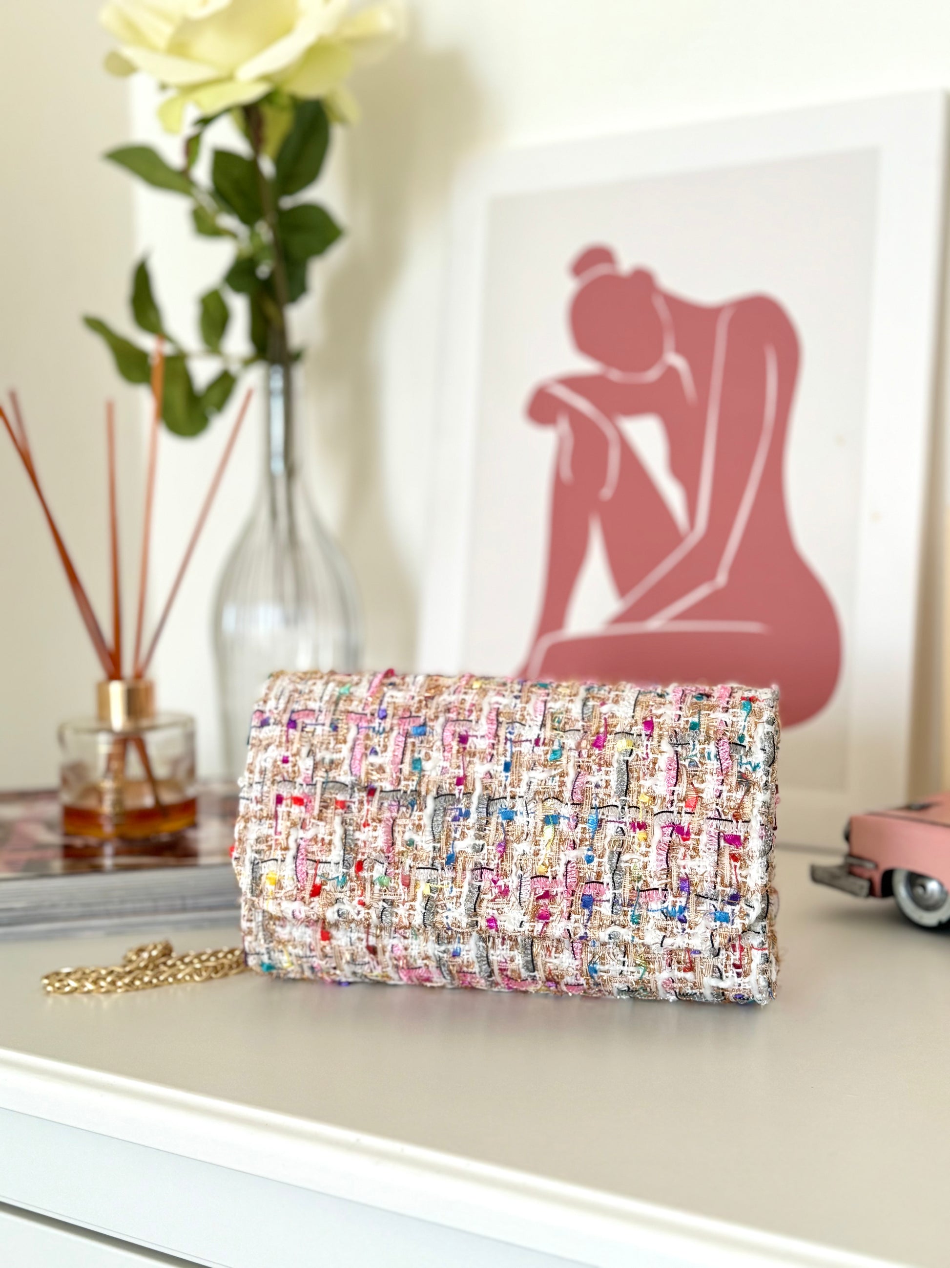 Interamente realizzata a mano in tessuto tweed, è impreziosita da fili dorati e intrecci multicolor che le conferiscono carattere e lucentezza.